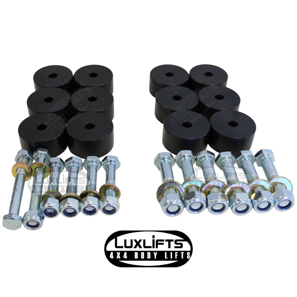 Toyota Landcruiser Body Lift Kit, made out of fully machined High-Density Polyethylene, with grade 8.8 high tensile bolts, washers and nuts. Blocks are 60mm diameter.